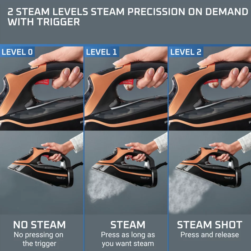 - Powerful 250 g/min steam boost blasts through even the toughest creases