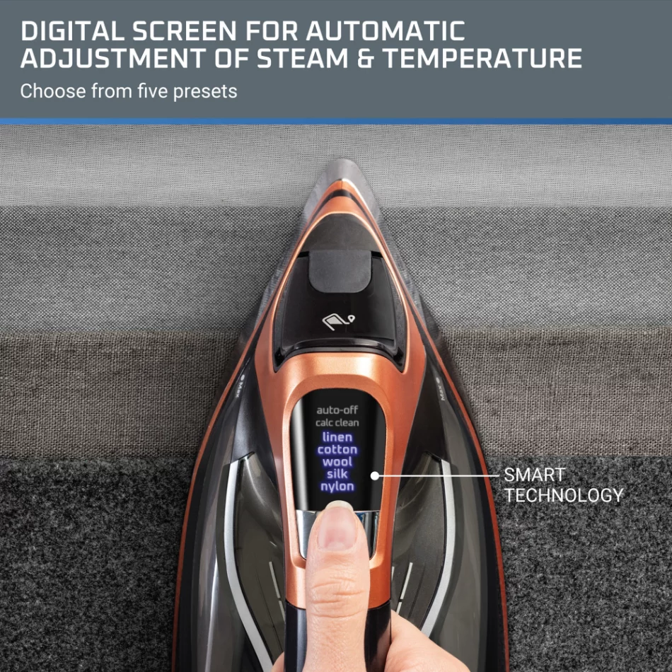 - High-tech digital smart screen with 5 automatic presets for perfect temperature and steam settings on every fabric