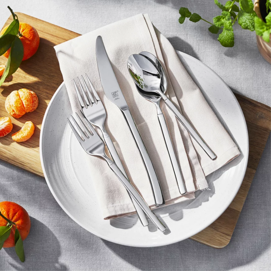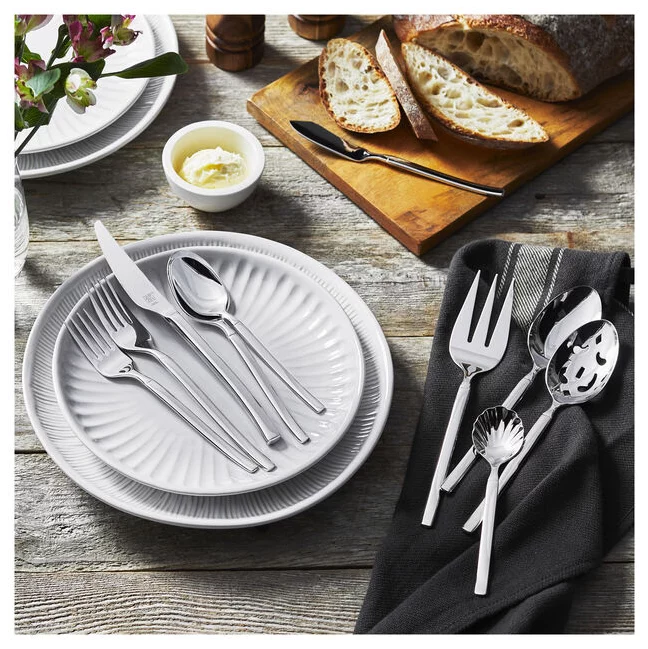 Each piece is fabricated from high-quality 18/10 stainless steel, with a long-lasting silver-like luster. The dinner knife is forged for superior cutting precision. The flatware features carefully polished surfaces and edges which both look and feel good. The heavy gauge and substantial sizing result in perfect balance and the feeling of quality in the hand. ZWILLING flatware is dishwasher safe.