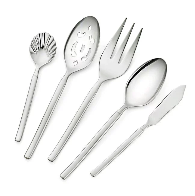 - Set includes 8 x 5-piece place settings. 5-piece setting includes dinner fork, salad fork, soup spoon, teaspoon, and dinner knife. Serving pieces include serving spoon and fork, slotted spoon, butter knife, and sugar spoon.