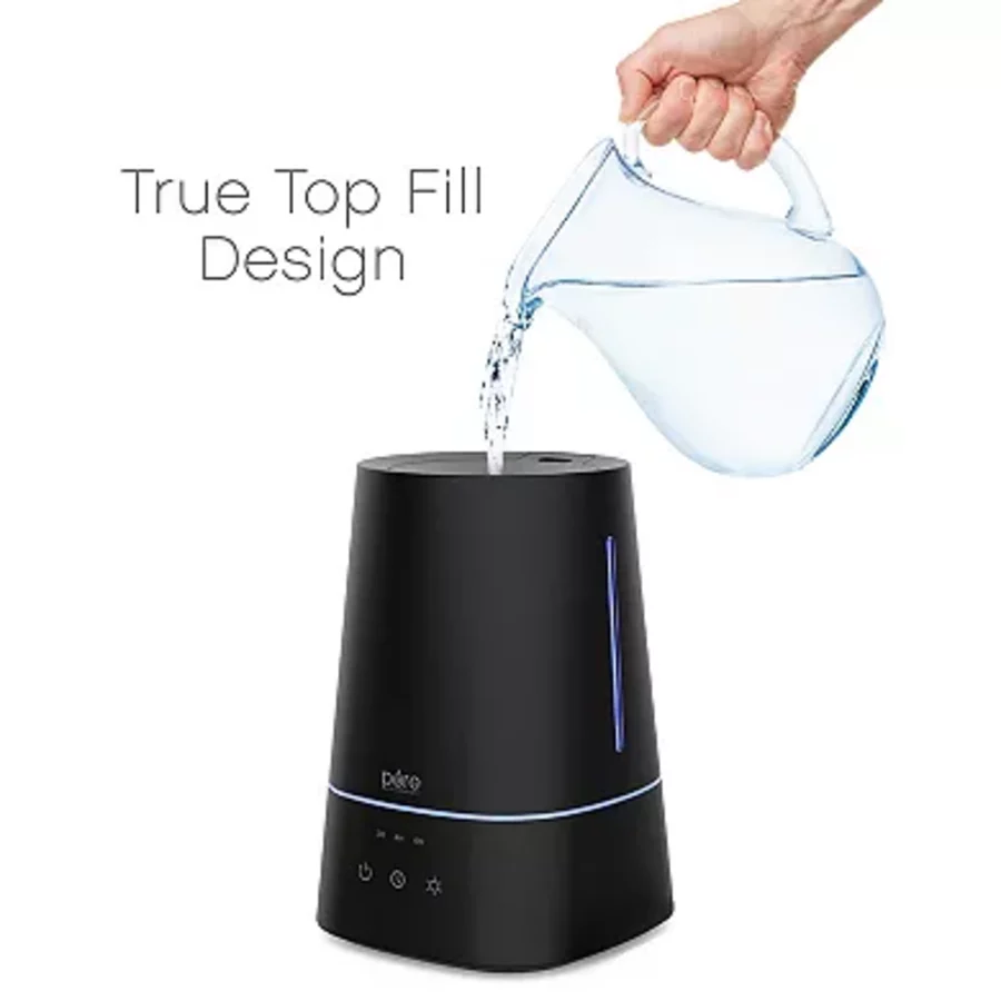 I ended up returning this because the pictures make it appear smaller. I was so excited for this, but I don’t know what I was thinking when I missed the description showing it can take one gallon! This is a beautifully simplistic, minimalist design and I love it, and would HAPPILY buy a model more in line with the size of their XL 3-in-1 (or smaller) for my nightstand. That being said, the top fill design is simple and genius, I just wish there was a way to direct the mist forward, instead of just straight up. I really appreciate this product and the design team that created it!