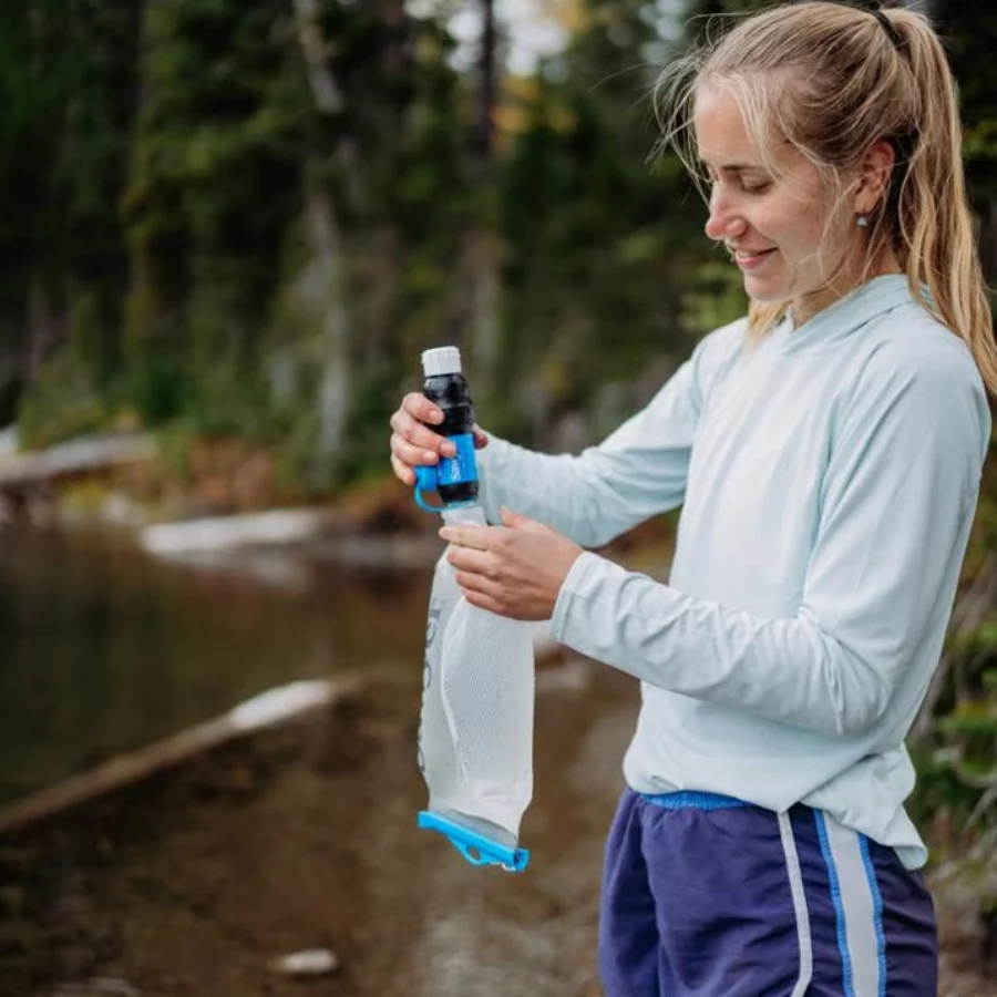 - Use it as a squeeze filter on the go or hang it as a gravity setup at camp.