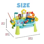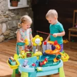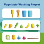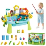 Multi-Sensory Water Play Set for Toddlers: This 16.34″L x 12.8″W x 7.87″H water table toys set offers a dynamic blend of water exploration, pretend kitchen play, and fishing games. Designed for outdoor engagement, toddlers can wash toy vegetables, “clean” dishes, and catch floating creatures, fostering fine motor development and imaginative storytelling.