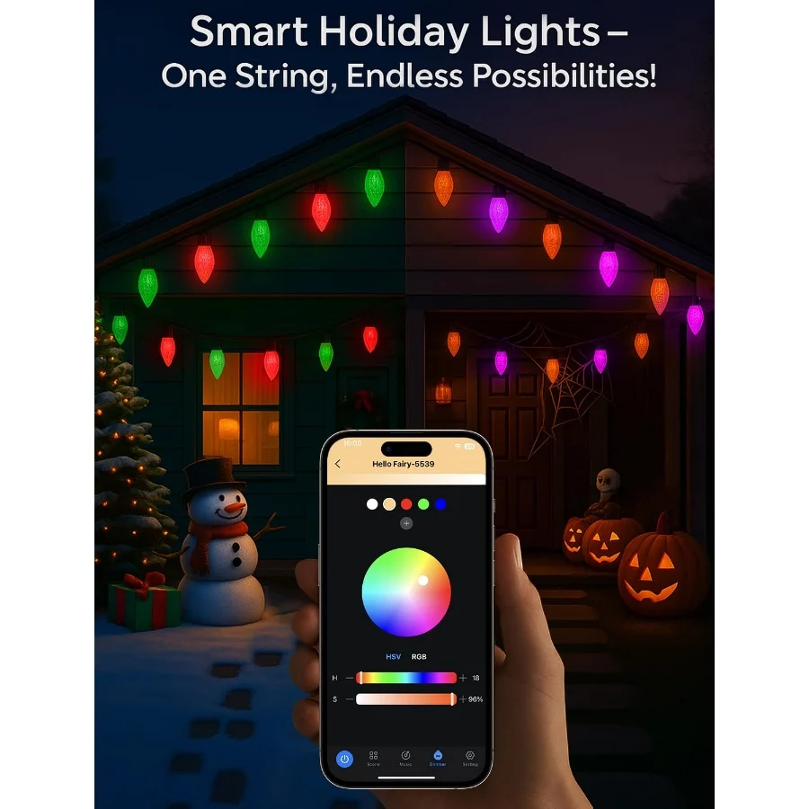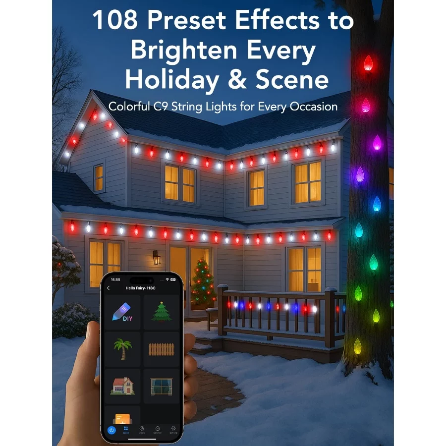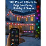 App Controlled Christmas Lights with Multi-Scene Modes These app controlled christmas lights work with the Hellofairy App, supporting 108 lighting modes, DIY settings, music sync, timers, and brightness adjustment. Ideal for balconies, gutters, or door frames, these c9 smart christmas lights outdoor let you customize effects and schedules directly from your phone.