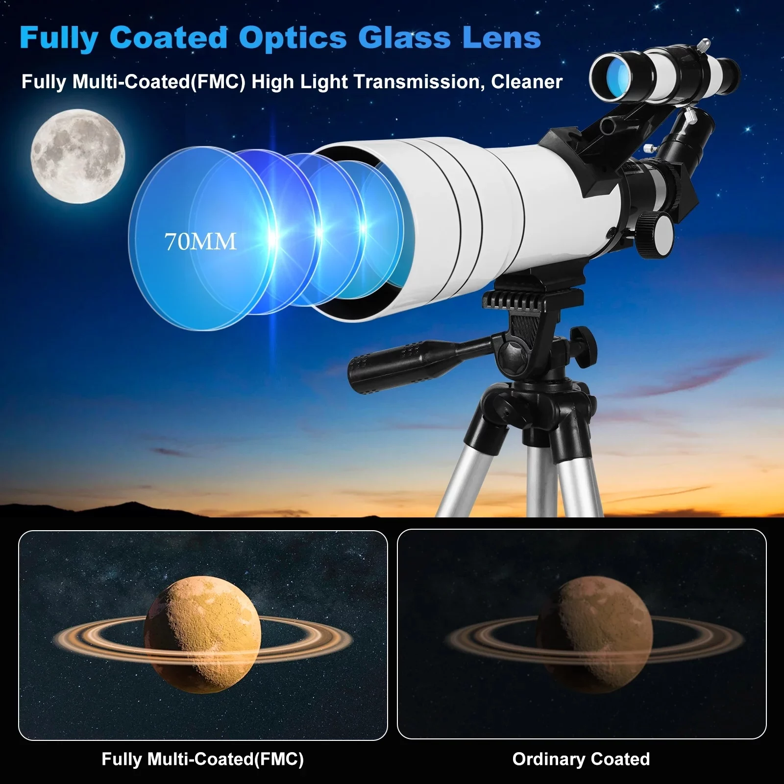 ENHANCED OPTICAL PERFORMANCE: Immerse yourself in celestial beauty with fully multi-coated optics, offering heightened contrast and brightness. The 70mm large aperture objective provides a wider field of view, capturing breathtaking celestial scenes with clarity and precision.
