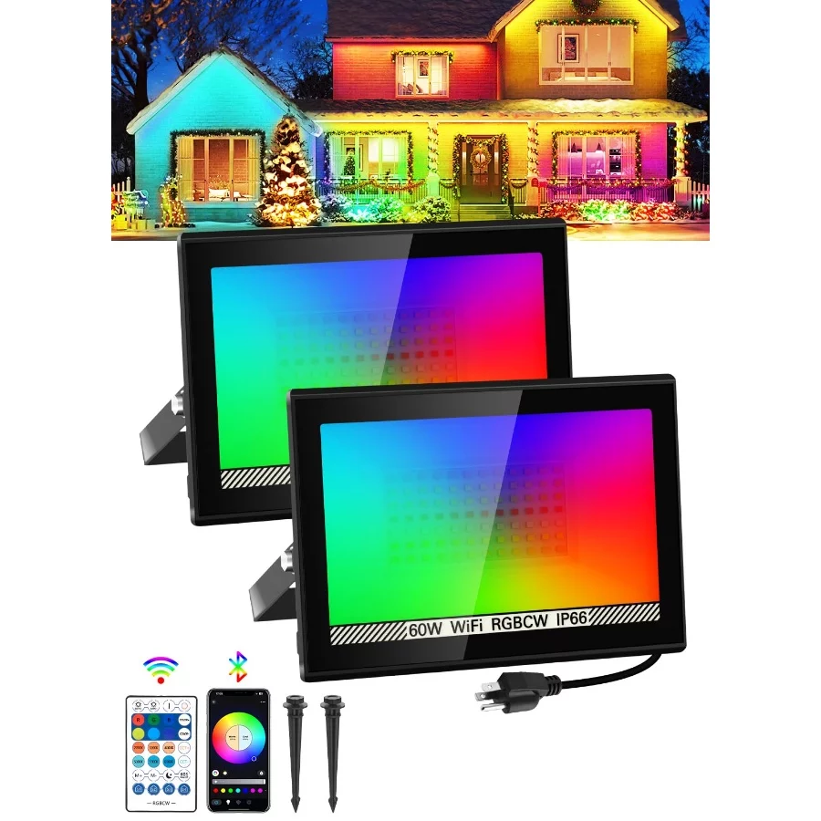 T-SUN 60W RGB Smart LED Flood Lights Outdoor, 6000LM APP Controlled Landscape Lights, Waterproof, Music Sync, Timer, 4 Pack.