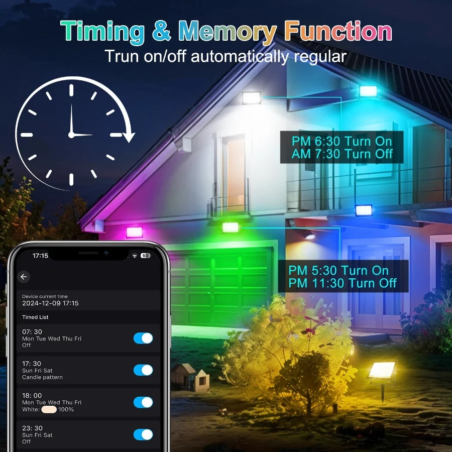 Music Sync and DIY Dynamic Mode: Using smart chips, color-changing landscape floodlights allow you to choose each lamp’s color or mode and then match them to your favorite settings. Whether it’s the romantic music of a wedding or the lively dance music of a holiday party, our color-changing landscape light can also change colors in time with the song. I think this will meet your need in many ways. The lights will dance to the music when you activate the music rhythm feature in the mobile app.
