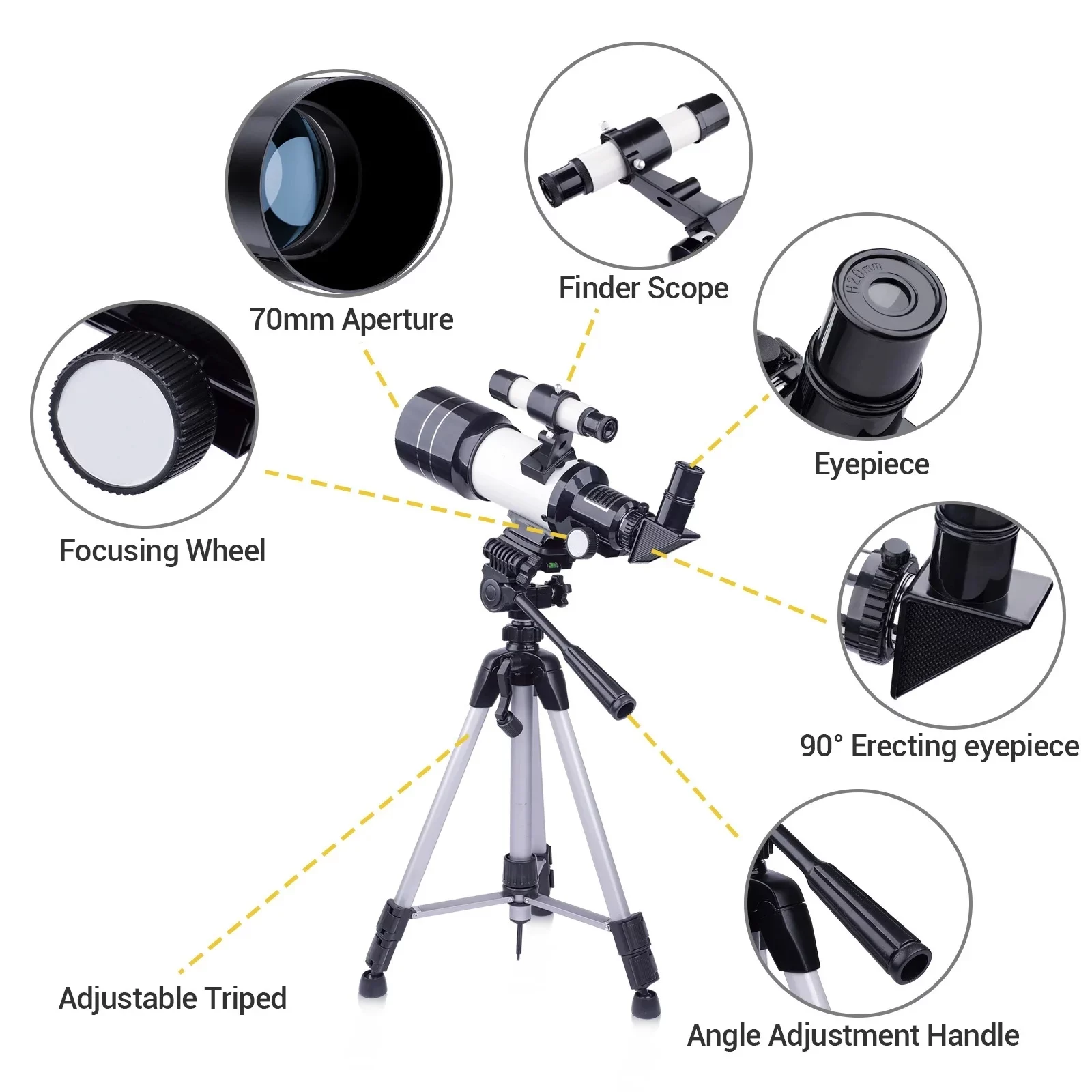 Astronomical Telescope for Adults has an aperture of 70mm and focal length of 300mm, magnification of about 12X to 50X. The high-transmittance optics can increase the light transmission while reducing the reflection of light, which can meet most of the conditions for observing the universe. The telescopes is equipped with a star finder scope, which can help people find the location of celestial objects faster. It is a perfect helper for adult beginners. This travel telescope is portable with the carry bag. It is configured with a 43in tripod, we can use the telescope to observe the astronomical landscape at anytime and anywhere with the help of the tripod. This beginner astronomical telescope can be adjusted by the angle of the lens to get a position that you feel comfortable, improve your experience of observing moon. A thoughtful gift for friends as birthday gift.