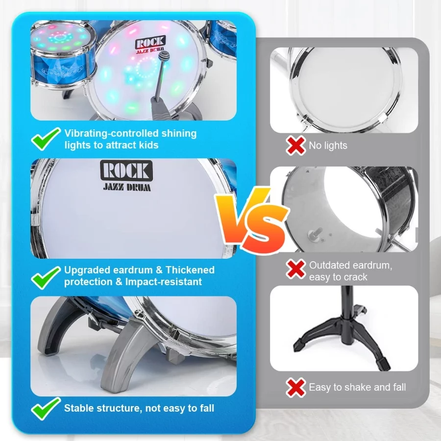 Kids Drum Set:Upgraded higher drum set (22.8in*14.6in*28in ) . Comes with Drums, Cymbal, Drum sticks, etc. Featuring that emit vibrant lights with each beat, this drum set kit is ideal for toddlers aged 1-3 who want to explore the world of percussion.