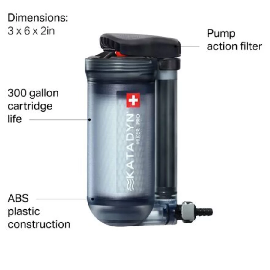 - A quick stop at a river or stream with the pump-action Katadyn Hiker Pro Water Microfilter lets you continue on your long trek with hydration packs and water bottles full of clean, clear drinking water. Carrying gallons of water isn’t necessary when you have reliable water sources and are carrying this durable 11-ounce water microfilter in your backpack. Since it connects directly to your hydration pack and water bottles, you spend more time on the trail and less time fiddling with your water supply.