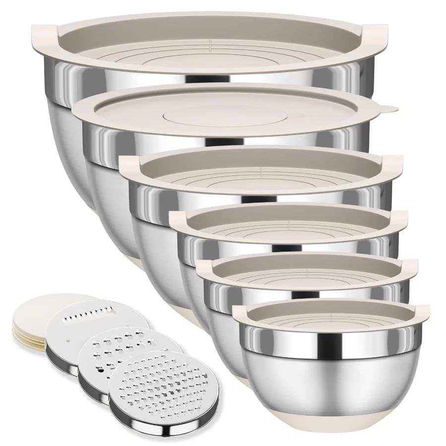 Umite Chef Mixing Bowls Set 6 PCS, Stainless Steel with Airtight Lids, Nesting Bowls with Grater Attachments, Non-Slip Base 5–1.1QT Sizes.