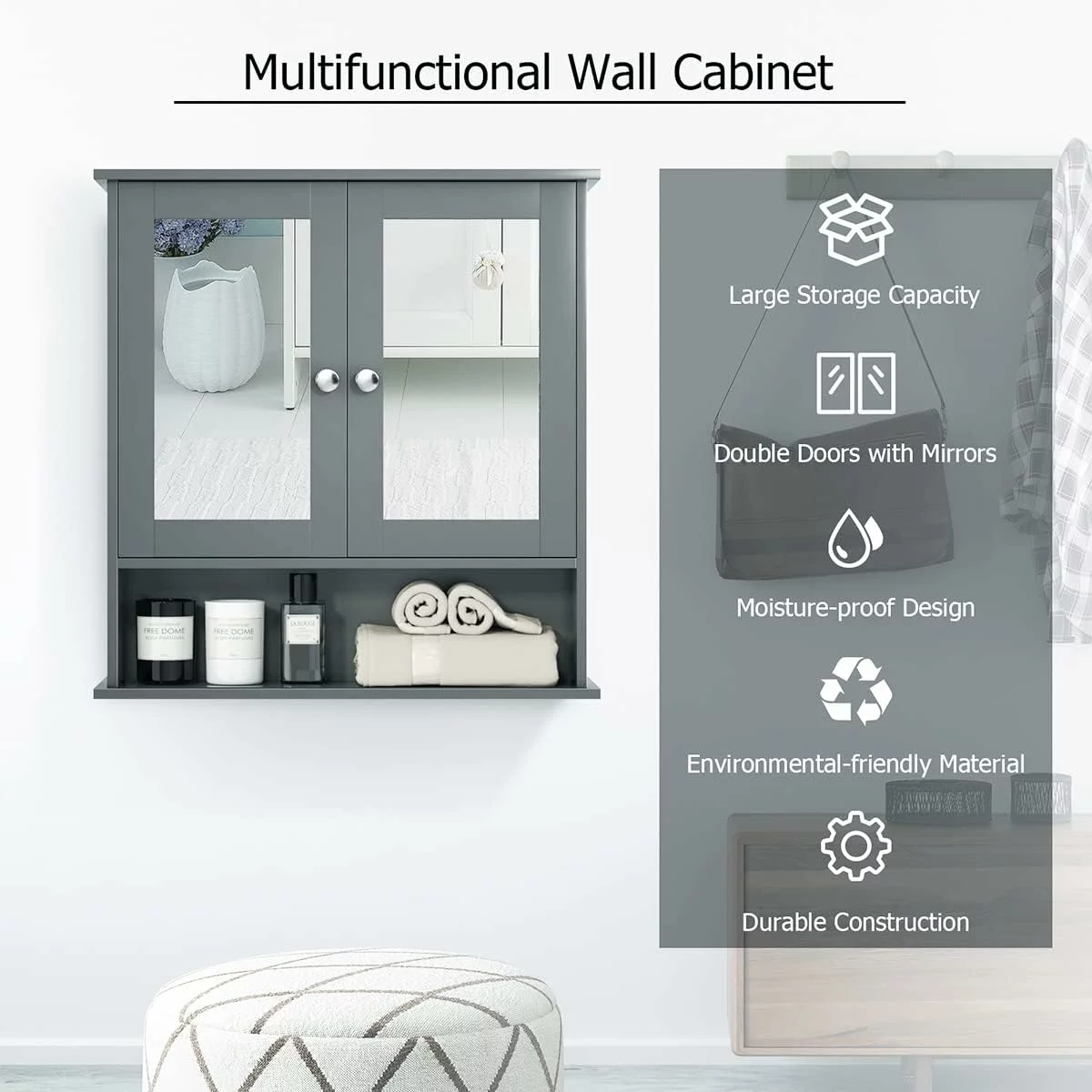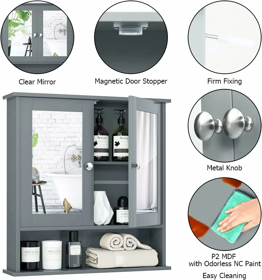 Multi-function Use: Bathroom wall cabinet is ideal for bathroom, bedroom, living room or kitchen. It features enclosed shelf with double mirror doors, and one open shelf to place towels, soap, tissues and other decorative items. In addition you can also put some green small plants on the open shelf to make your item neat and beautiful.