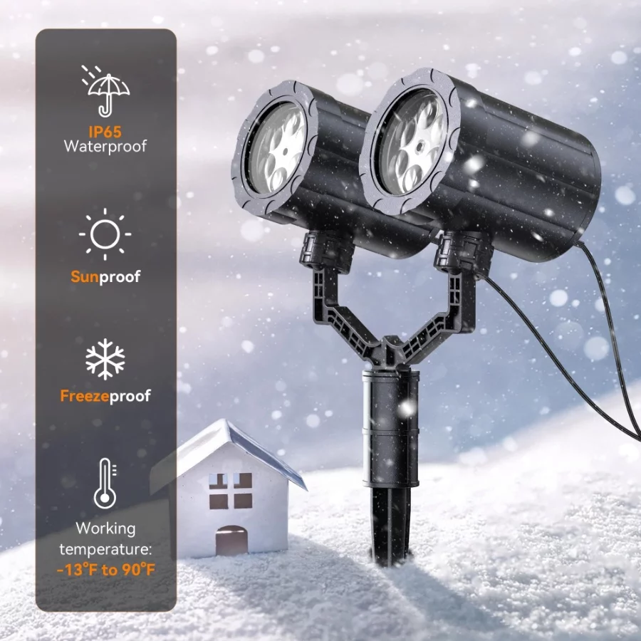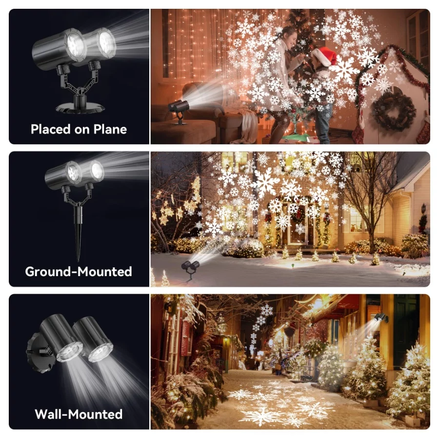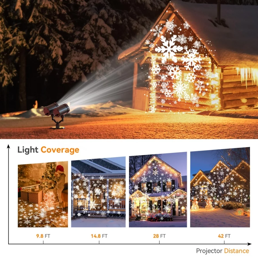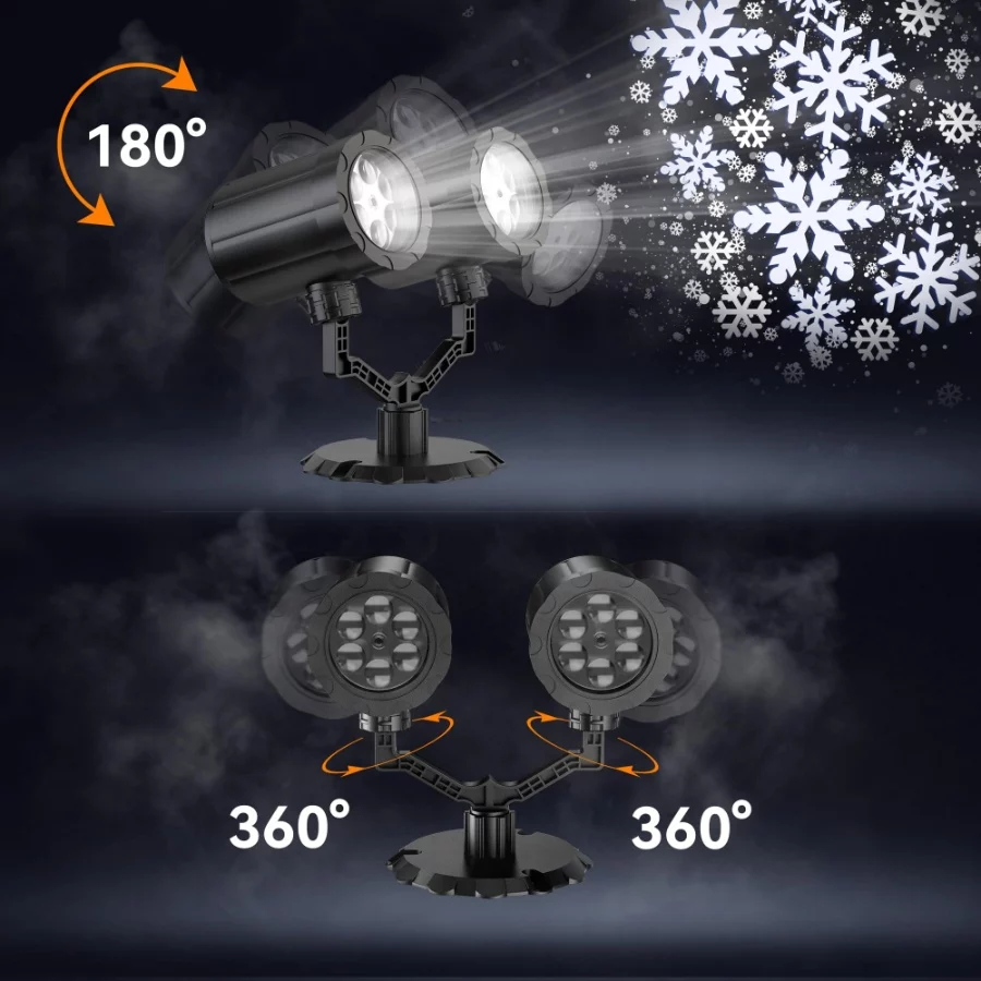 HeyStookie 2024 Upgrade Snowflake Projector Lights: Equipped with 12 (6×2) high brightness LED lights, the snowflakes are clearer and brighter, with smooth animation. Soft white dots and snowflakes of different sizes can dynamically simulate snowflakes falling, creating vivid and realistic scenes of various sizes and shapes, just like snowflakes falling on your wall or house.
