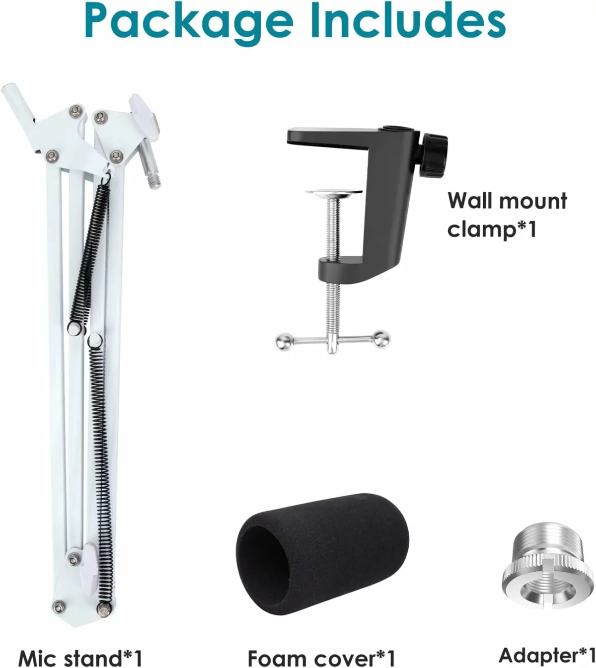 All-in-one Combo – Package includes white QuadCast mic stand, table mounting clamp, 3/8″” to 5/8″” screw adapter, mic cover foam. NOTE: Not Included QuadCast Microphone!