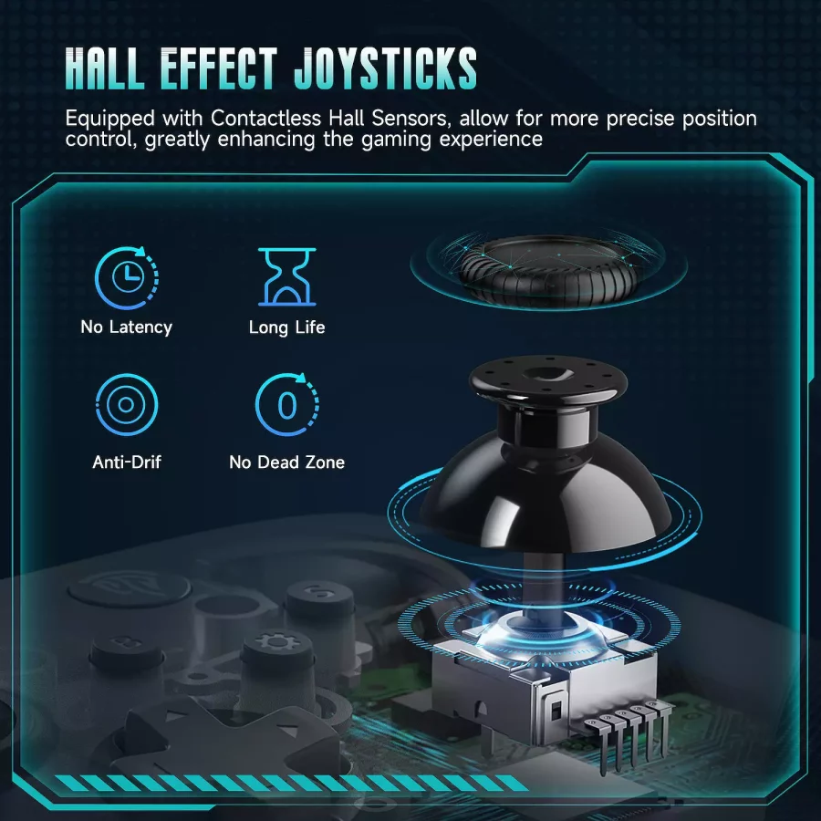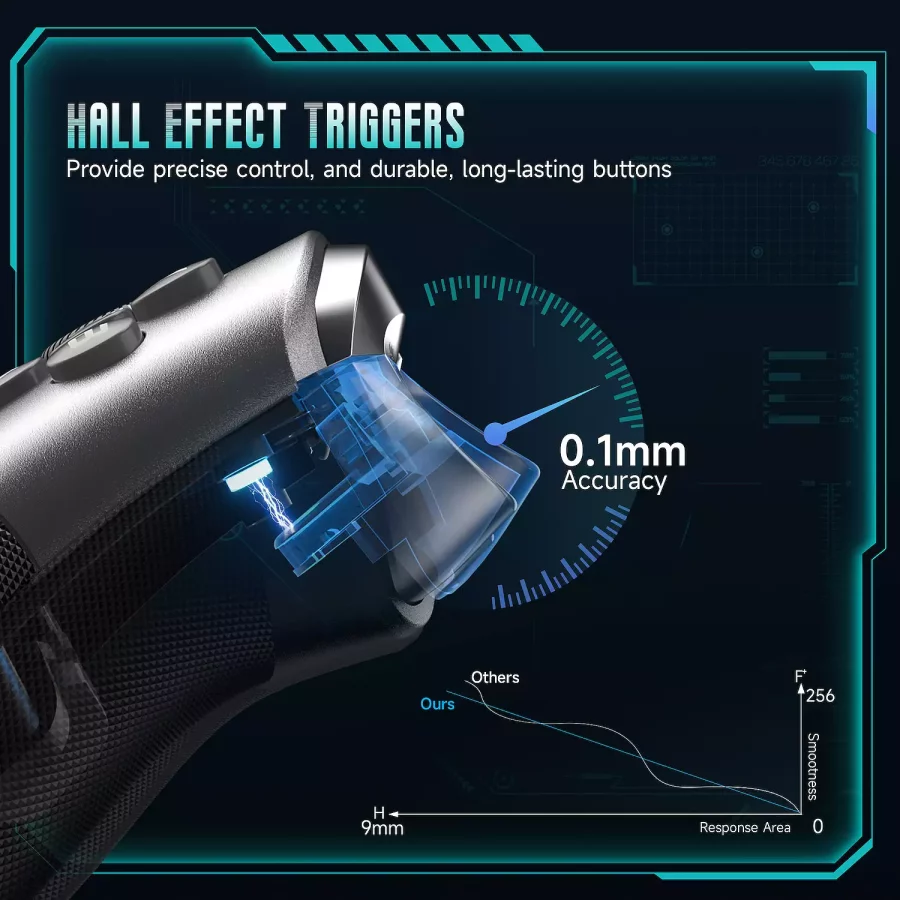 • Hall effect joysticks and triggers with four sensors for precise, reliable input