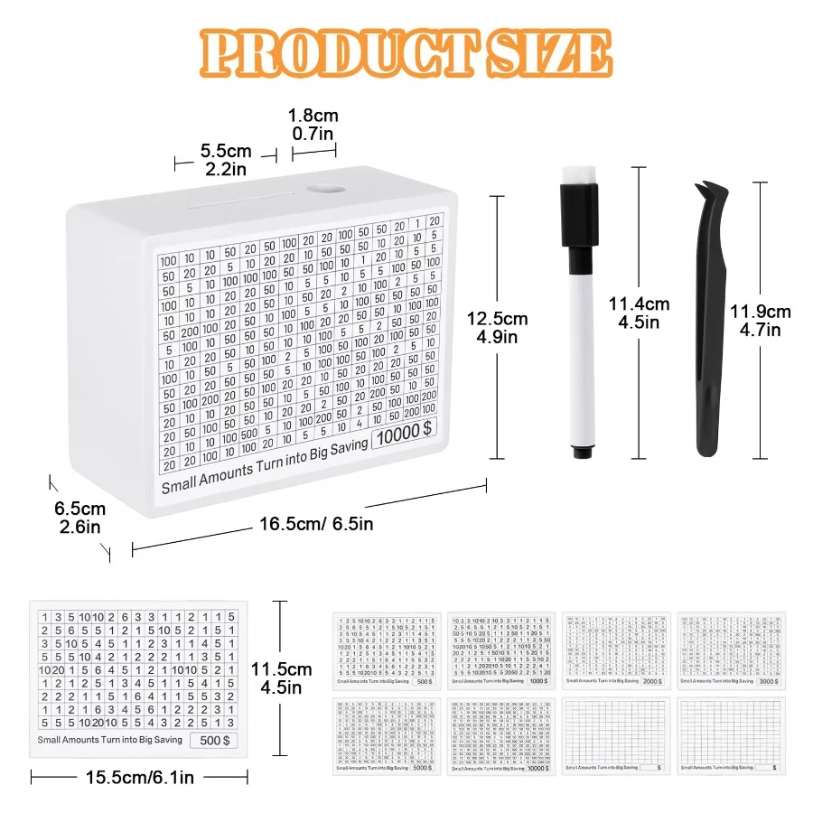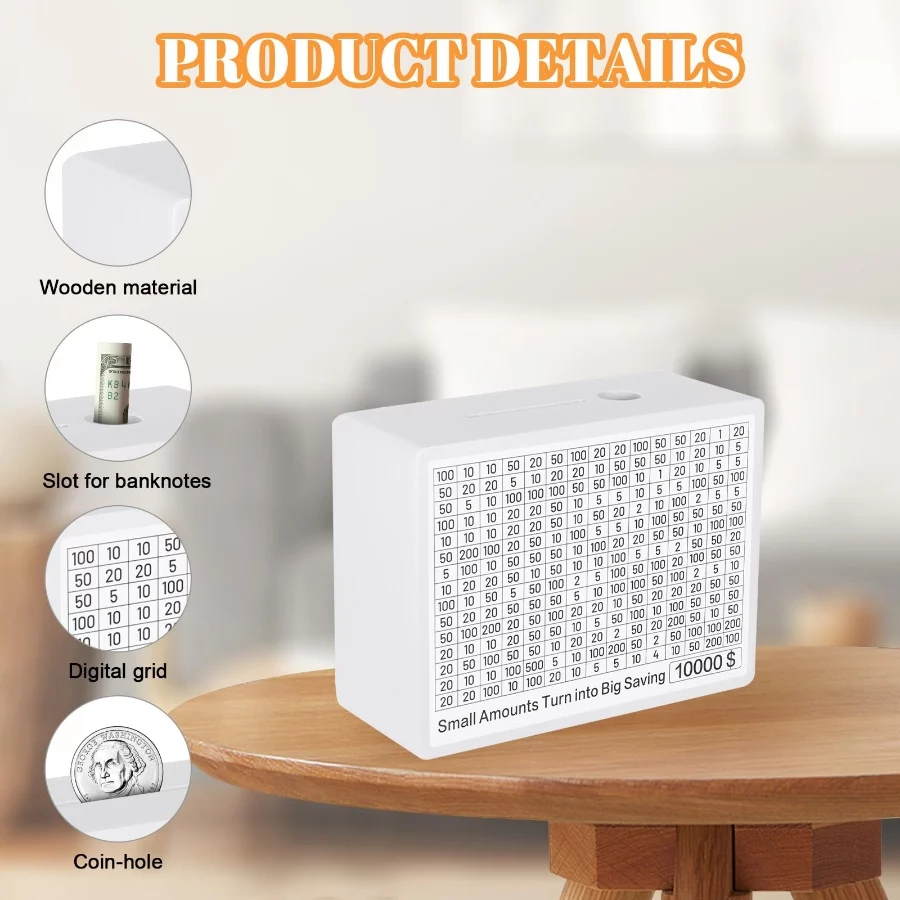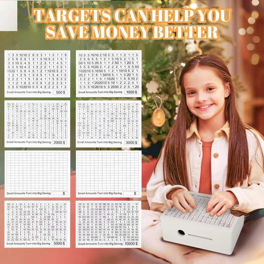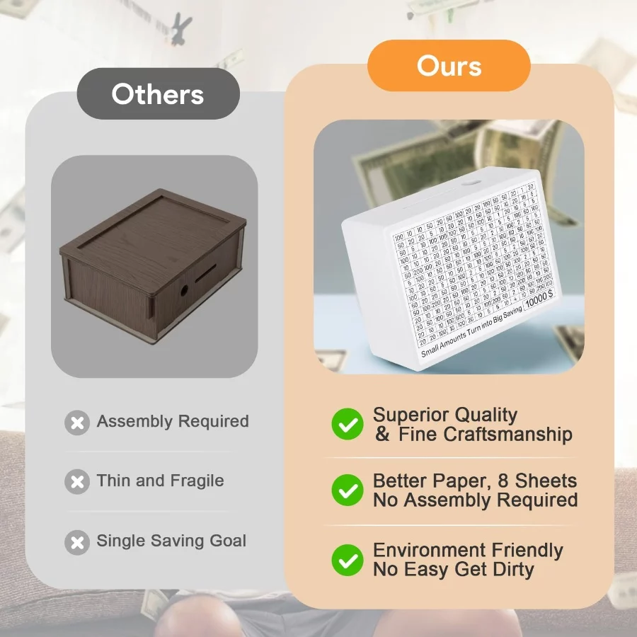 Transform Your Savings: Elevate your financial goals with our innovative Wooden Money Box, featuring 8 distinct savings targets. Each Piggy Bank includes sheets labeled $500, $1000, $2000, $3000, $5000, and $10000, plus 2 blank sheets for personalized targets. Use the tracking stickers to monitor your progress, keeping you motivated as you move closer to your financial milestones.