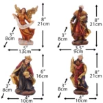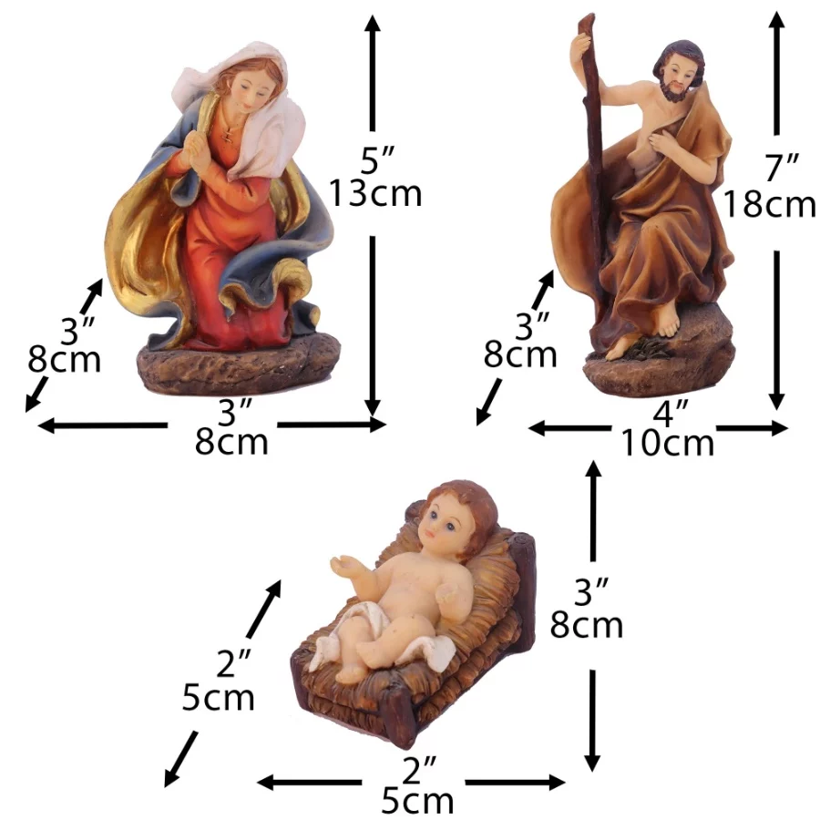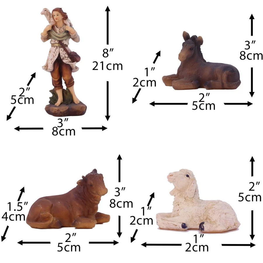 VThe nativity set include Joseph,Mary,Jesus,Shepherds,Angel,The Three Kings ,Cow,Sheep and Donkey.SIZE:8 Inch(Do not include stable)